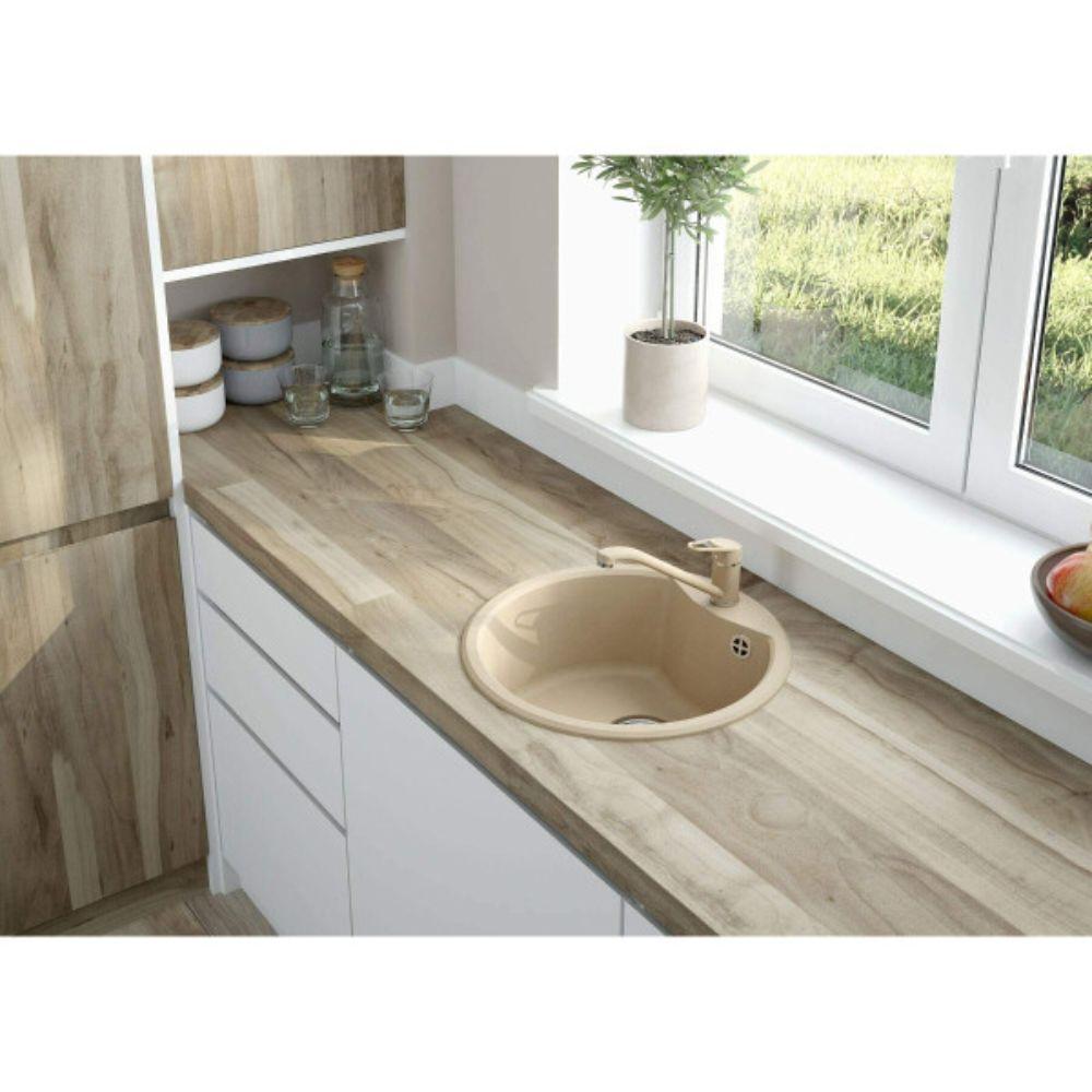 Napravljen od visokokvalitetnog granitnog materijala, ovaj model je otporan na ogrebotine, toplotu i hemikalije. Pesak boja unosi toplinu i prirodan ton u prostor, dok dimenzije 48 x 48 cm omogućavaju optimalno korišćenje prostora bez kompromisa po pitanju funkcionalnosti.